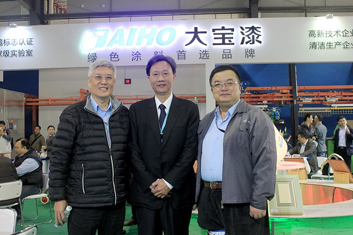大寶國(guó)際董事長(zhǎng)陳賀生先生(中間)與大寶化工總經(jīng)理陳春華先生、大寶化工工程部劉昌屏經(jīng)理(右一)于大寶漆展位合影