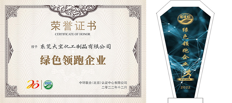 東莞大寶化工制品有限公司榮獲由中環(huán)聯(lián)合認(rèn)證中心授予的“綠色領(lǐng)跑企業(yè)”榮譽(yù)稱(chēng)號(hào),這是對(duì)東莞大寶化工30年來(lái)不斷在綠色環(huán)保方面追求卓越的最好嘉許。
