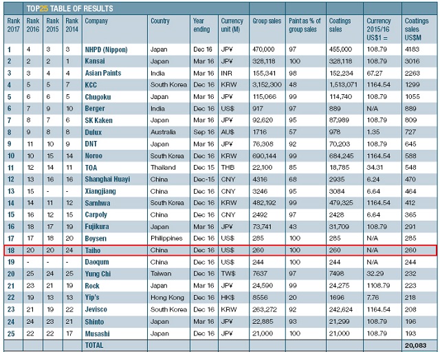 2017年亞太地區(qū)涂料企業(yè)排名前25強(qiáng)榜單