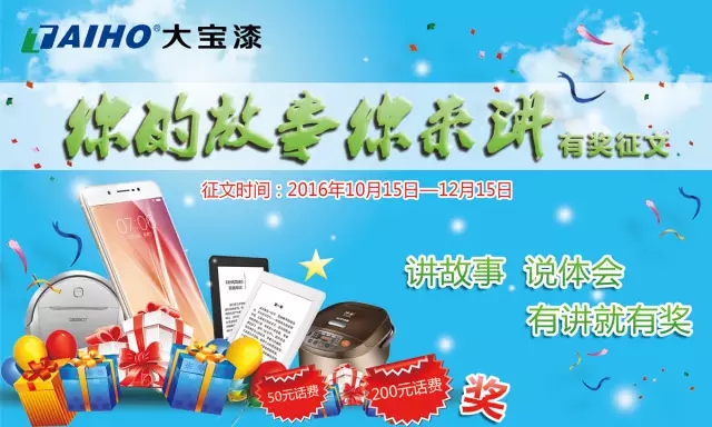 為更好地促進大寶漆各經銷商同仁間的交流與互助,讓經銷商同仁分享成功的經驗,通過分享市場第一線員工的成功案例及心得體驗,并以此作為學習楷模,取其智慧精華,促使各地經銷商同仁互補優勢、共同提升,故大寶漆官方微信和大寶報聯合主辦“你的故事你來講”有獎征文活動。