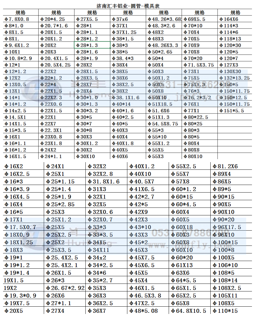 公司可根據客戶要求開模定做、歡迎中外朋友來匯豐鋁業參觀指導,洽談業務,共謀發展。以下為濟南匯豐鋁業部分規格模具表: