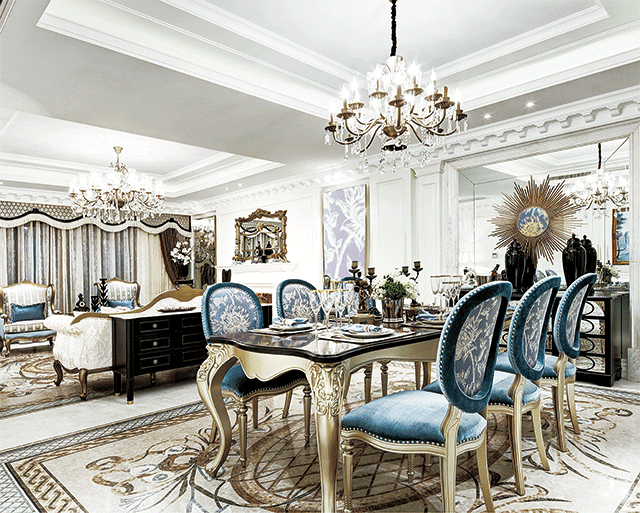 同時,法式家居也常用洗白處理與華麗配色,洗白手法傳達(dá)出法式鄉(xiāng)村特有的內(nèi)斂特質(zhì)與風(fēng)情,配色以白、金、深色的木色為主調(diào)。結(jié)構(gòu)粗厚的木制家具,例如圓形的鼓型邊桌,大肚斗柜,搭配搶眼的古典細(xì)節(jié)鑲飾,再輔以優(yōu)質(zhì)環(huán)保的大寶水漆進(jìn)行養(yǎng)護(hù),呈現(xiàn)皇室貴族般的品味。