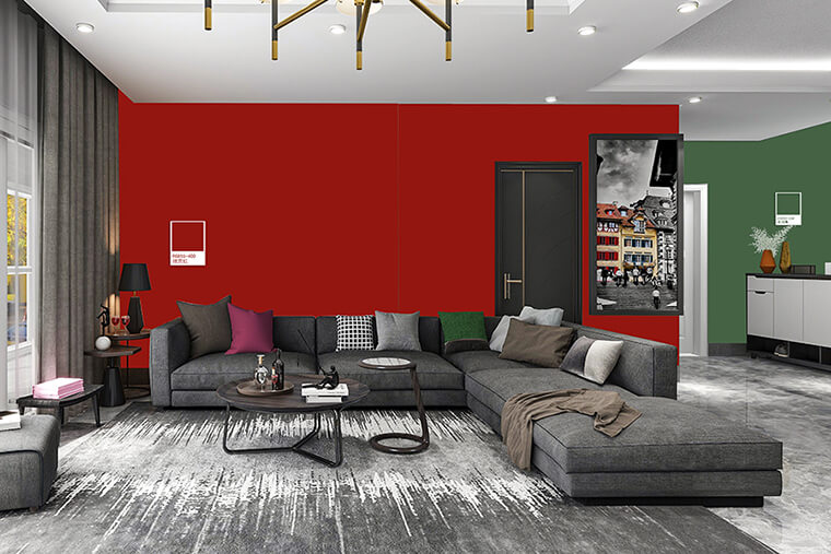 在考慮色彩配置時,若無法接受飽和度太高的紅,非常推薦使用大寶R8855-40D故宮紅,屬于低彩度深紅色系,除了與上述顏色搭配外,更適合放在空間某處作為焦點,例如玄關、電視背景墻..等,讓人不自覺的往此處吸引,在視覺上擁有亮點帶出時尚摩登感。